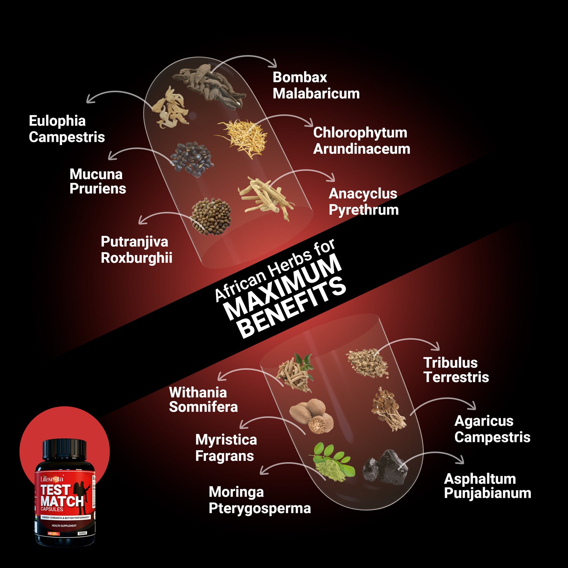 Answer: Test Match Capsule are natural supplements with Withania Somnifera, Mucuna Pruriens, Tribulus Terrestris, Asphaltum Punjabianum, Chlorophytum Arundinaceum, Bombax Malabaricum, Putranjiva Roxburghii, Myristica Fragrans, Eulophia Campestris, Moringa Pterygosperma, Anacyclus Pyrethrum, Agaricus Campestris designed to boost energy, stamina, and pleasure. Trusted by 100,000+ customers, they’re suitable for men's.